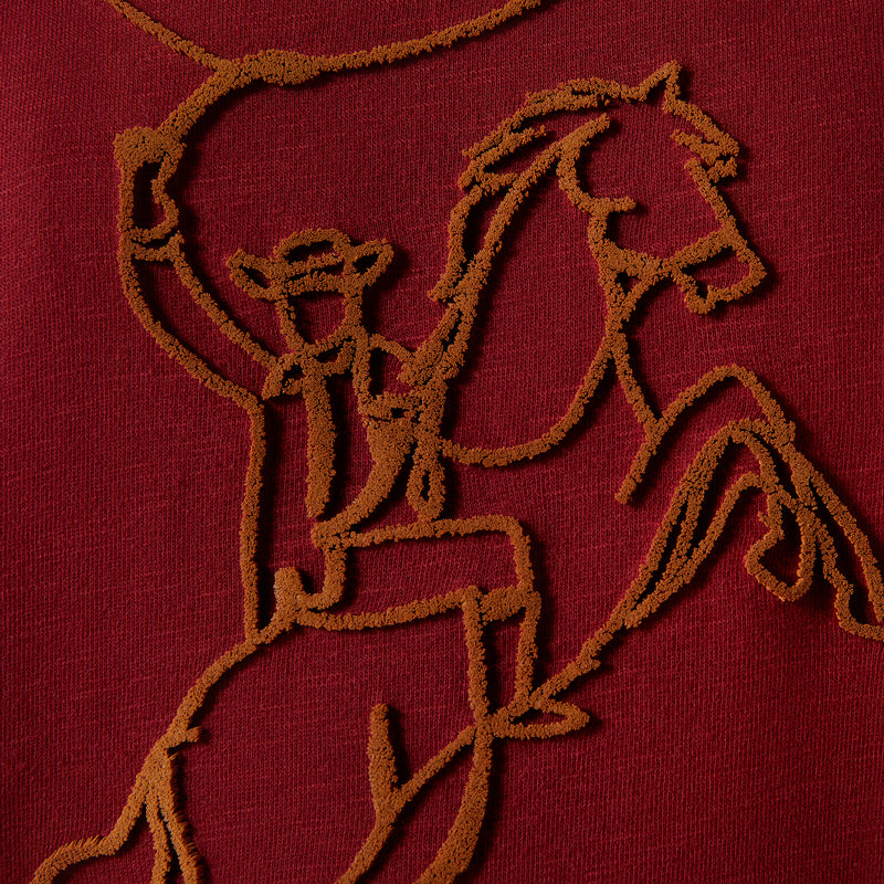 • Statement flocked cowboy graphic front and centre